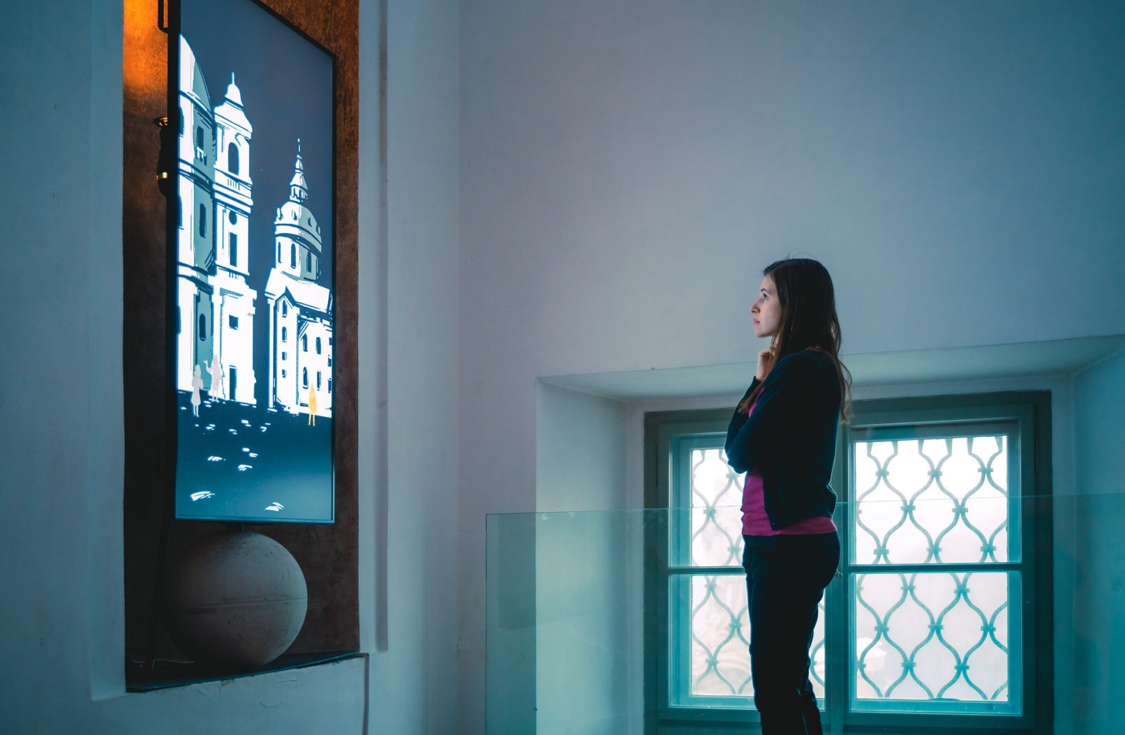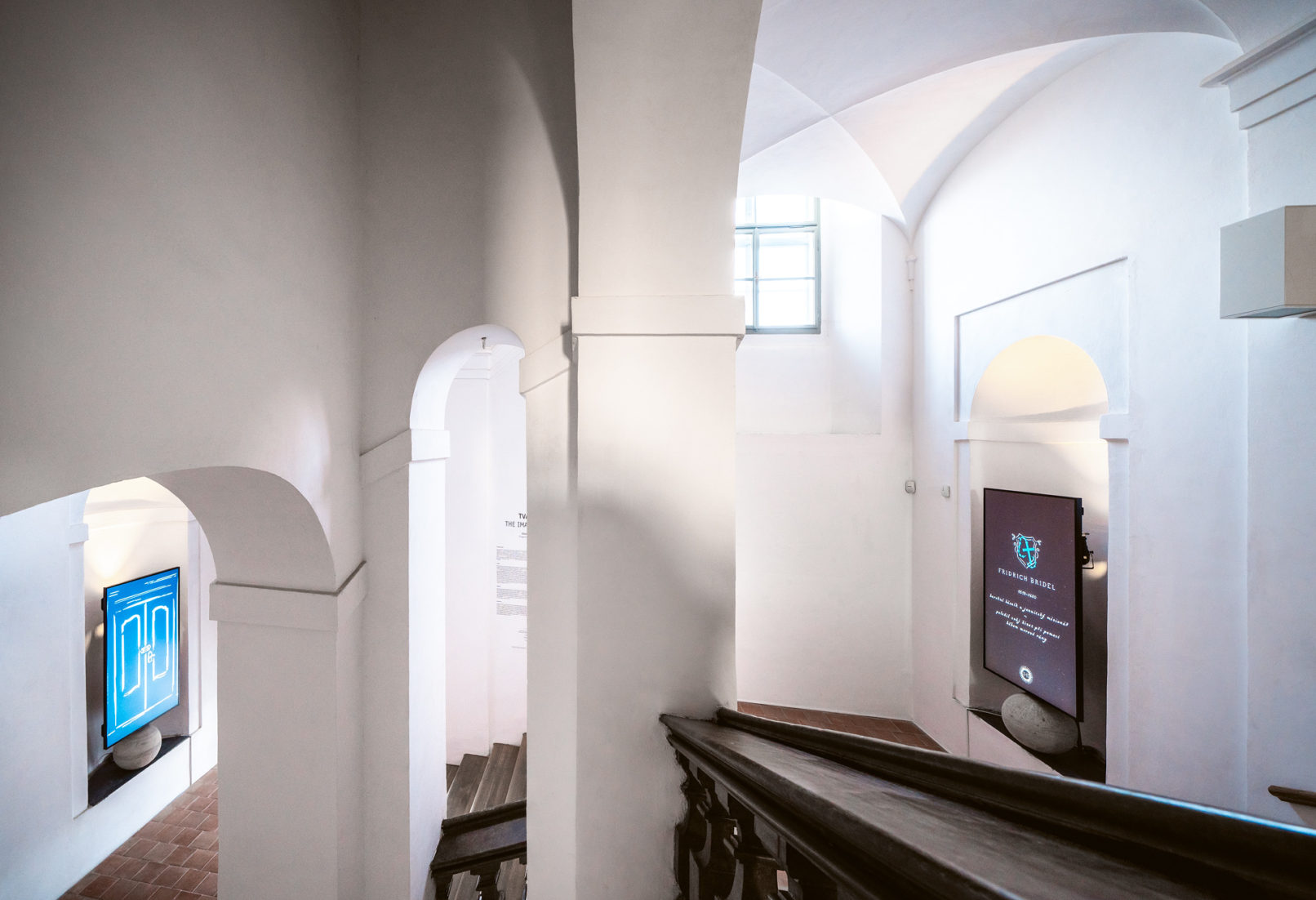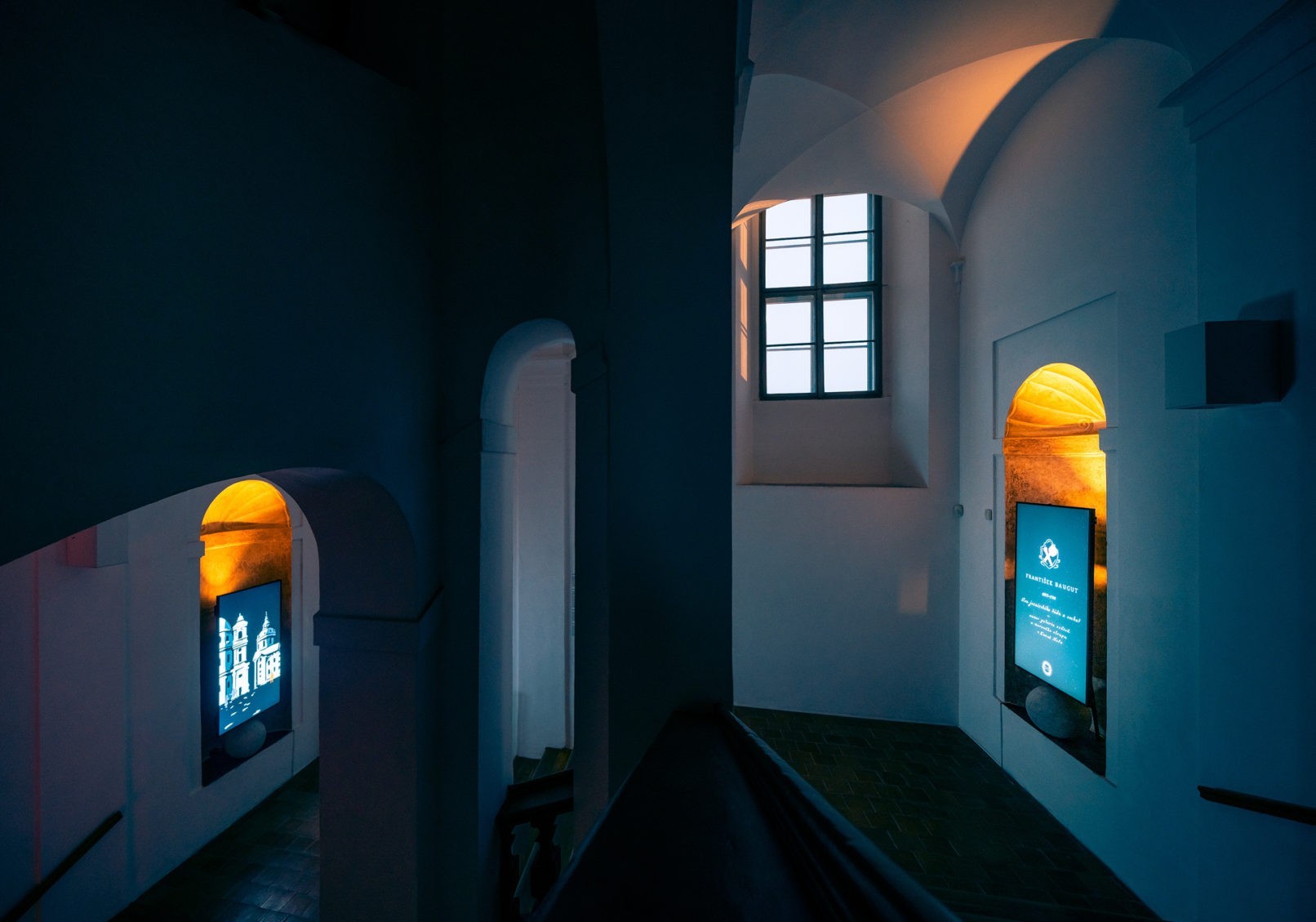 Společně jsme využili barokní niky na severním schodišti. V nich se nacházejí portály do minulosti, krátká animovaná videa vyprávějící příběhy, které ovlivnily tvář a historii jezuitské koleje.