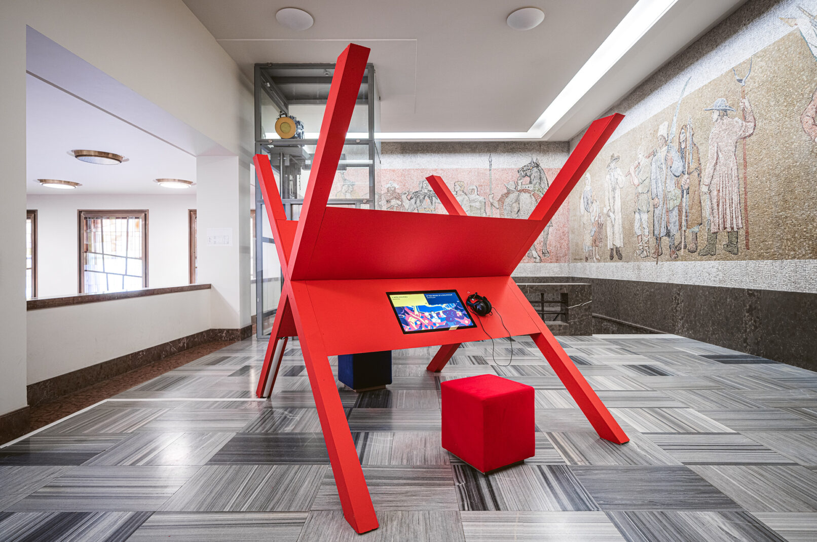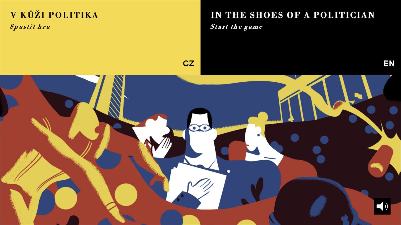 - Nejkomplexnějším audiovizuálním prvkem je hra V kůži politika. V ní si návštěvník vyzkouší, jak je pro politiky složité dělat rozhodnutí, udržovat popularitu a být znovu zvolen. Hra je zhruba na dvacet minut a můžete si ji zahrát i na Itch.io nebo na oficiálních stránkách výstavy.